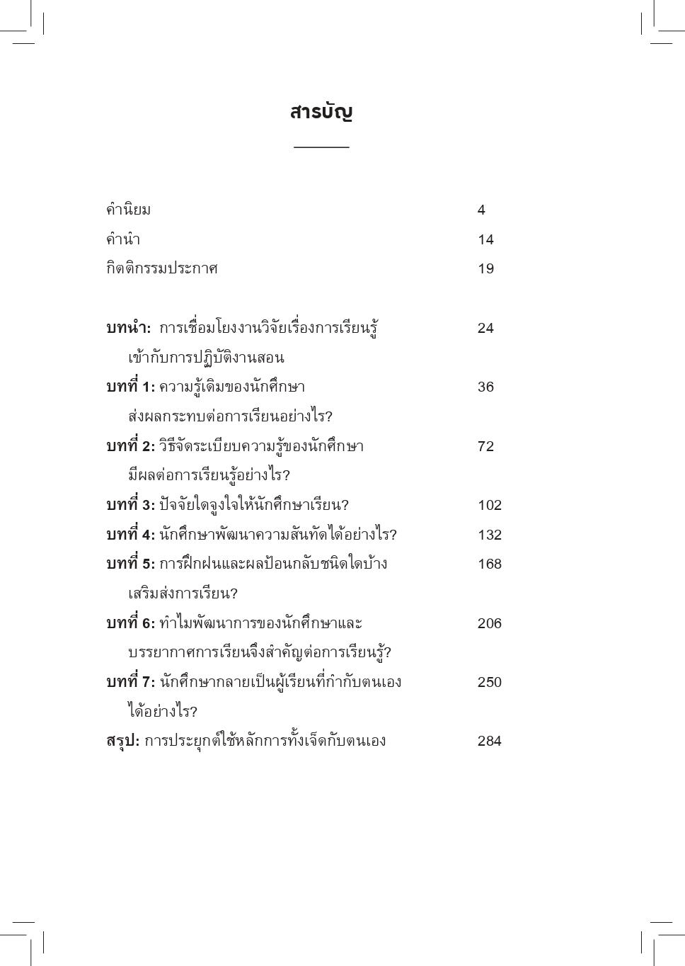 หนังสือเล่มนี้สรุปหลักการเกี่ยวกับการเรียนรู้ที่มาจากงานวิจัย ซึ่งครอบคลุมประเด็นต่าง ๆ เช่น การสร้างแรงจูงใจ ความรู้พื้นฐาน การฝึกฝนทักษะ การเรียนรู้ด้วยตนเอง การประเมินความก้าวหน้า ฯลฯ การทำความเข้าใจในแต่ละหลักการเหล่านี้เป็นพื้นฐานสำคัญในการออกแบบการเรียนการสอน