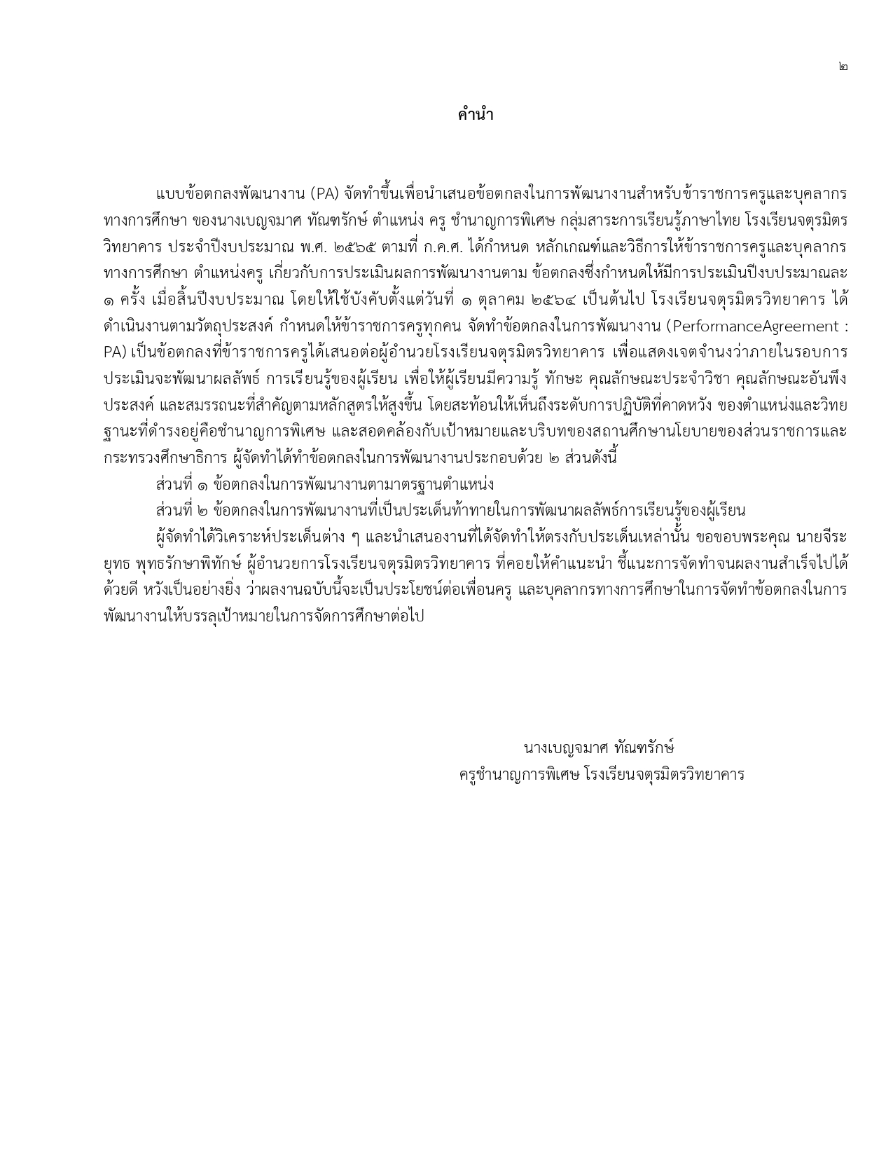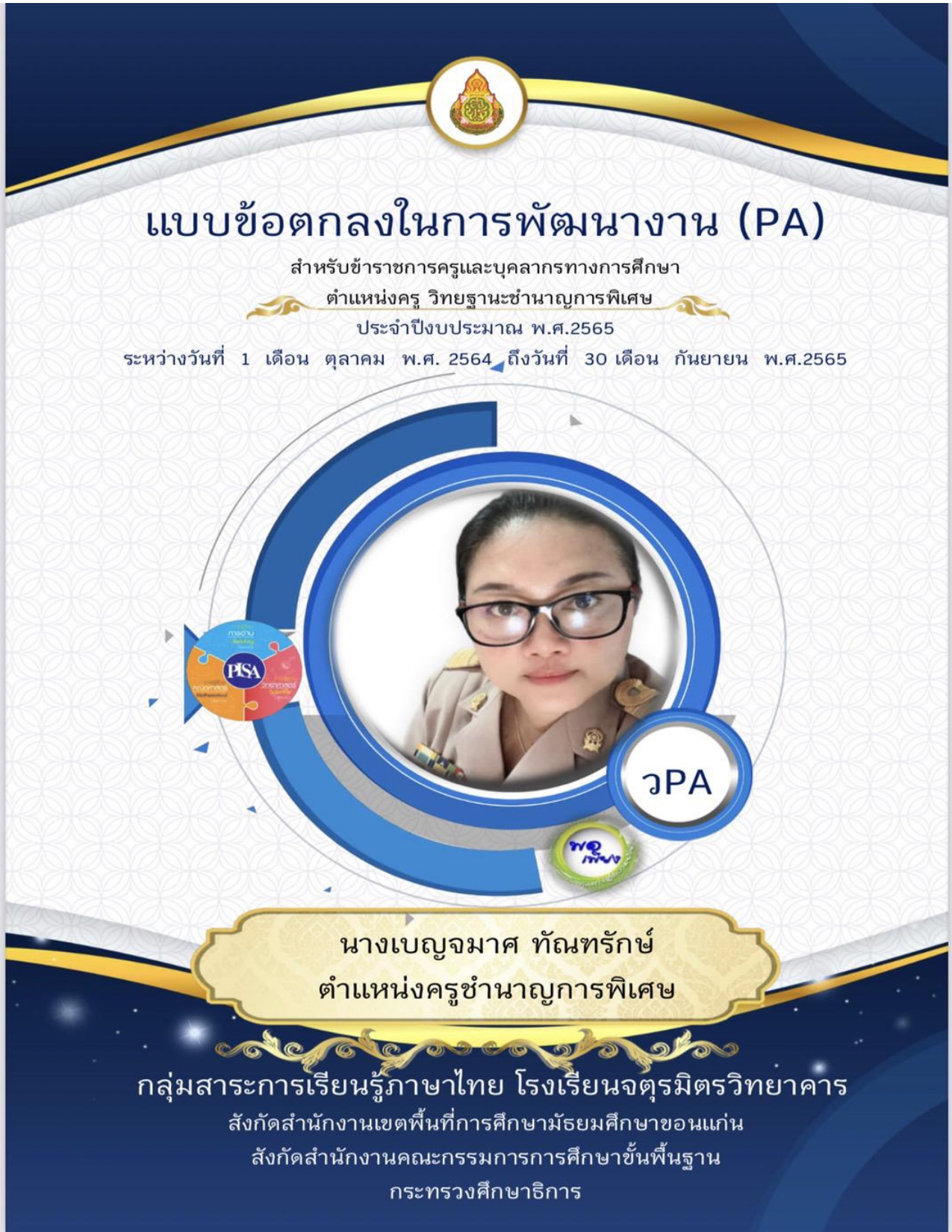 การพัฒนาครูและบุคลากรทางการศึกษาถือเป็นรากฐานสำคัญของระบบการศึกษาไทยที่จะนำไปสู่การยกระดับคุณภาพการเรียนการสอนอย่างยั่งยืน สำหรับข้าราชการครูตำแหน่งครู วิทยฐานะชำนาญการพิเศษ ในกลุ่มสาระการเรียนรู้ภาษาไทย การจัดทำแบบข้อตกลงในการพัฒนางาน หรือที่เรียกว่า Performance Agreement (PA) เป็นเครื่องมือสำคัญที่จะช่วยให้การพัฒนาตนเองและการทำงานมีทิศทางที่ชัดเจนและมีประสิทธิภาพมากยิ่งขึ้น